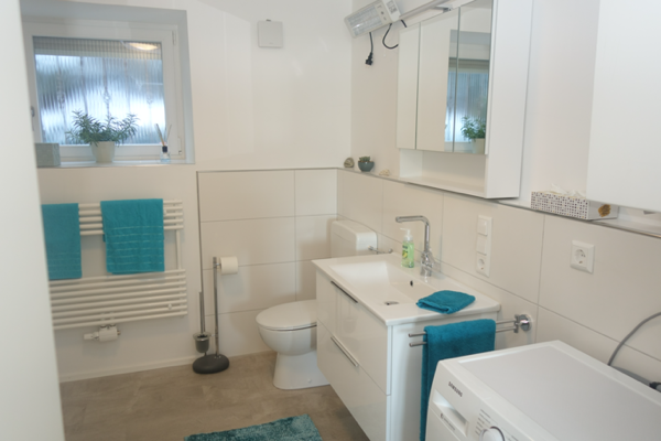 Das moderne Bad mit Dusche und WC hat einen Handtuchheizkörper, einen großen Waschtisch, einen Fön, eine Waschmaschine und einen Trockner.