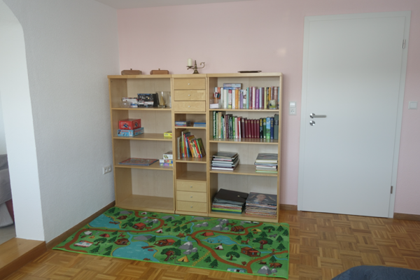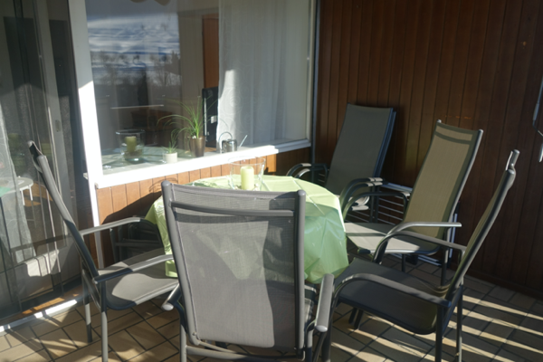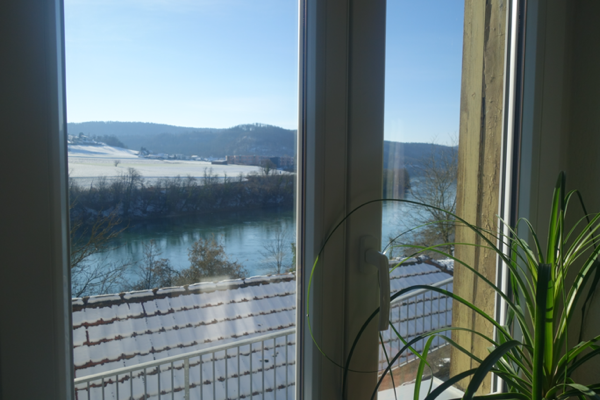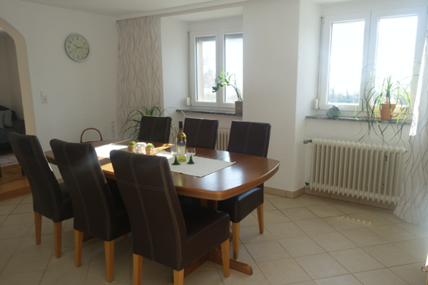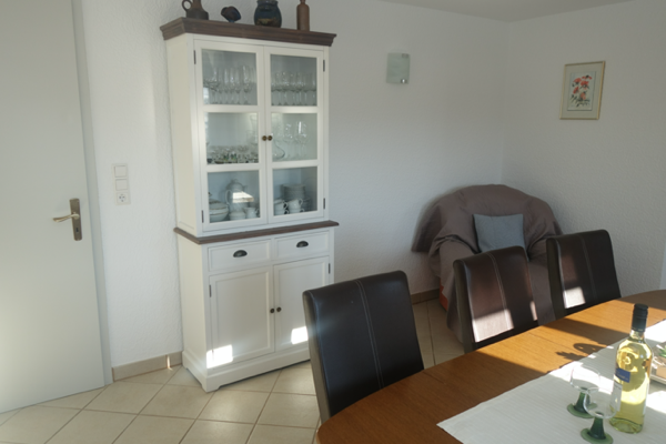 Im Eingangsbereich der Wohnung finden Sie eine kleine Garderobe. Im großen Esszimmer, welches einen Blick nach Süden zum Rhein bietet, befindet sich ein Tisch mit Platz für 6 Personen, sowie eine gemütliche Leseecke.
