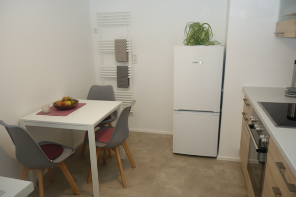 Die sehr gut ausgestattete Küche besitzt Geschirr, Gläser, Geschirrspülmaschine, Ceranfeld, Backofen, Mikrowelle, großer Kühlschrank mit 2 Gefrierfächern, Kaffeevollautomat, Toaster, Wasserkocher. Sie hat zudem einem Tisch mit Platz für 3 Personen.